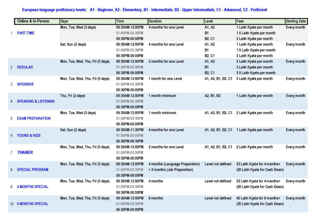 Class | A1, A2, B1, B2 – ၅ ရက်၊ နံနက် အတန်း | A1, A2, B1, B2 – ၅ ရက်၊ နေ့လယ် အတန်း | A1, A2, B1, B2 – ၅ ရက်၊ ည အတန်း |