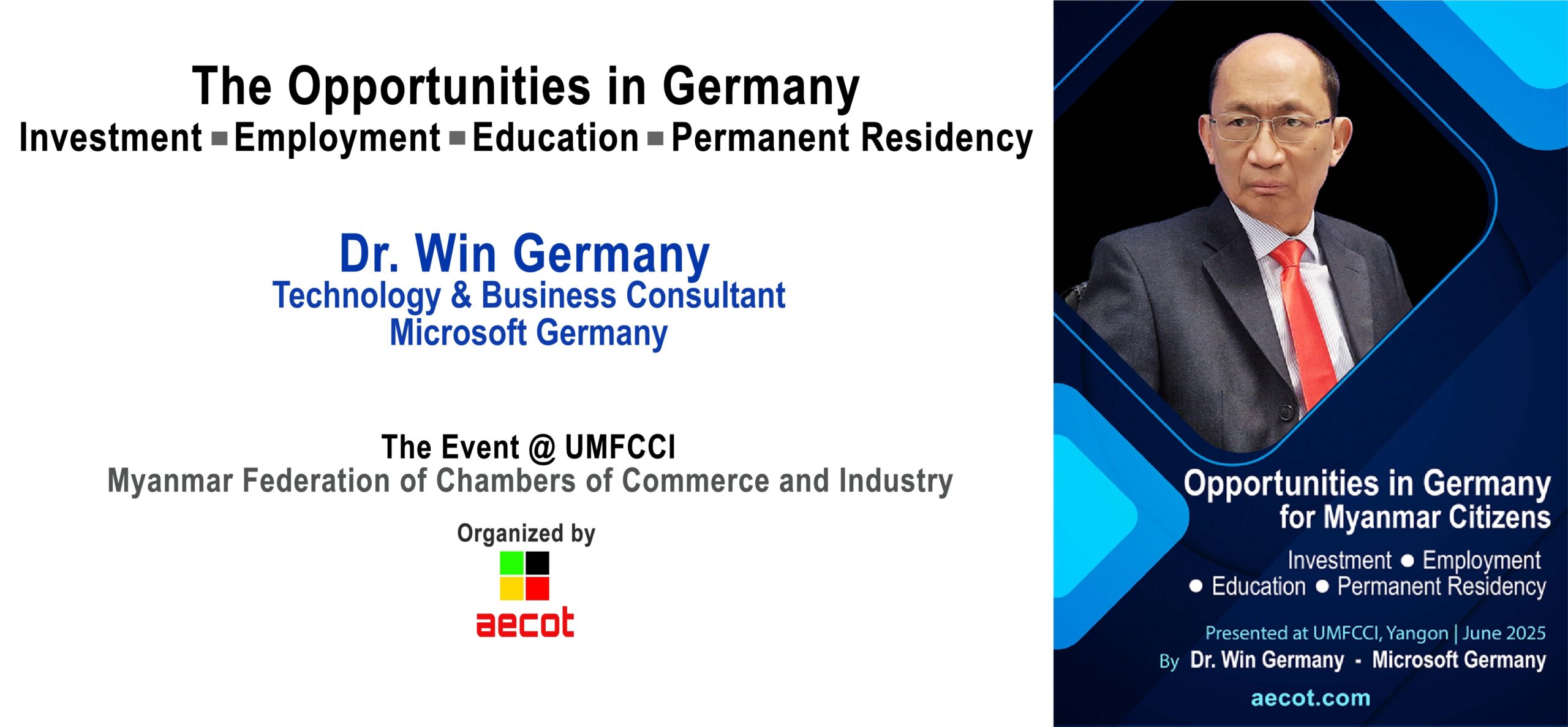 AECOT Consulting သည် ဂျာမနီတွင် အလုပ်လုပ်ရန်၊ ပညာသင်ရန်၊ ရင်းနှီးမြှုပ်နှံမှု လုပ်လိုသူများကို ၄ လ အတွင်း ဂျာမနီတွင် အကောင်အထည်ဖော်နိုင်အောင် ၂၀၁၉ ခုနှစ်ကတည်းက မြန်မာနိုင်ငံတွင် အကြံပေးလျက်ရှိသည်။